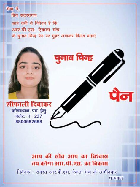 कोषा अध्यक्ष पद के तौर पर पहली बार चुनावी मैदान में उतरी पेशे से पत्रकार और सामाजिक कार्य में रुचि रखने वाली शीफाली दिवाकर का कहना है कि भारत विश्व का सबसे बड़ा लोकतांत्रिक देश है और लोकतंत्र में समाज सेवा करने के लिए चुनकर आना महत्वपूर्ण है। उन्होंने कहा कि मेरा उद्देश्य चुनाव लड़ना नहीं बल्कि समाज सेवा करना है। समय-समय पर वह अपने स्तर से आरपीएस के मुद्दे उठाती रही हैं पिछले कुछ समय से पानी की समस्या से जूझ रहे घरों को लेकर भी उन्होंने आवाज उठाई थी और शीफाली दिवाकर ने पानी की समस्या के समाधान के लिए दिल्ली जल बोर्ड के साथ बैठक भी की थी। हालांकि अभी पानी की समस्या का निवारण नहीं हो पाया है। उन्होंने कॉलोनी वासियों को भरोसा दिलाया कि अगर वह जीतकर आती है तो वह इस लड़ाई को और मजबूती और तेज गति से लड पाएंगी।
