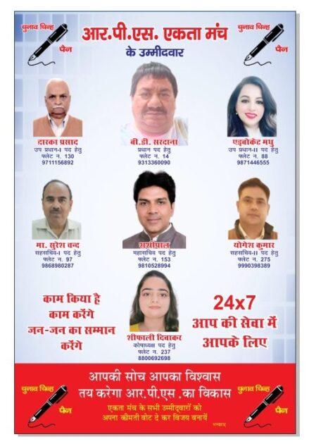 आपको बता दें कि आगामी 2 अक्टूबर को होने वाले चुनाव के लिए आरपीएस एकता मंच की तरफ से प्रधान पद हेतु बीडी सरदाना, उप प्रधान पद हेतु द्वारका प्रसाद व उप प्रधान द्वितीय पद हेतु एडवोकेट मधु ,महासचिव पद पर शशिपाल, सह सचिव प्रथम के पद पर सुरेश चंद, सह सचिव द्वितीय के पद पर योगेश कुमार और कोषाध्यक्ष के पद पर शीफाली दिवाकर चुनाव मैदान में है।