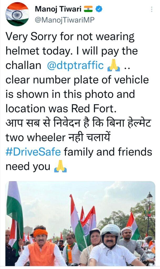 मनोज तिवारी ‘हर घर तिरंगा’ यात्रा के दौरान निकाली गई बाइक रैली में हेलमेट नहीं पहन रखा था। इसके अलावा वह बिना लाइसेंस के बाइक चला रहे थे और उनके पास पॉल्यूशन सार्टिफिकेट भी नहीं था। साथ ही बाइक पर हाई सिक्युरिटी नम्बर प्लेट भी नहीं लगी थी।