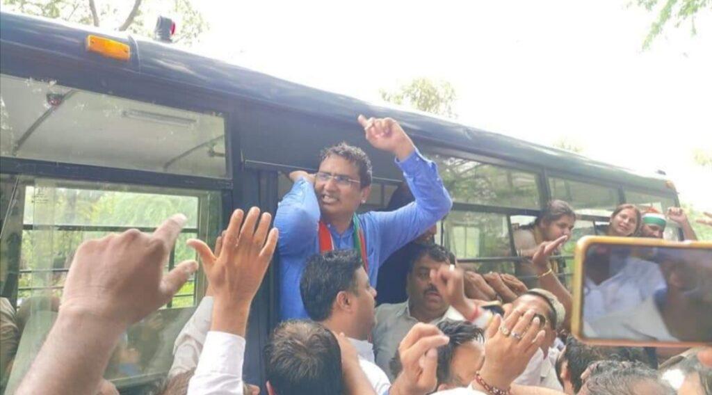 नई दिल्ली:-  दिल्ली प्रदेश कांग्रेस कमेटी के अध्यक्ष चौ0 अनिल कुमार के नेतृत्व में हजारों कांग्रेस कार्यकर्ताओं ने कांग्रेस अध्यक्ष सोनिया गांधी को भाजपा की केन्द्र सरकार के इशारे पर ई.डी. द्वारा पेशी पर बुलाने की अनैतिक कार्यवाही पर विरोध जताने के लिए आज उपराज्यपाल निवास का घेराव किया। प्रदेश अध्यक्ष ने कहा कि सोनिया जी के साथ पूरा देश खड़ा है और कांग्रेस का कोई भी सिपाही न कभी डरा है और न ही डरेगा और तानाशाह मोदी सरकार के खिलाफ सत्य और न्याय की लड़ाई के लिए हम लड़ते रहेंगे।