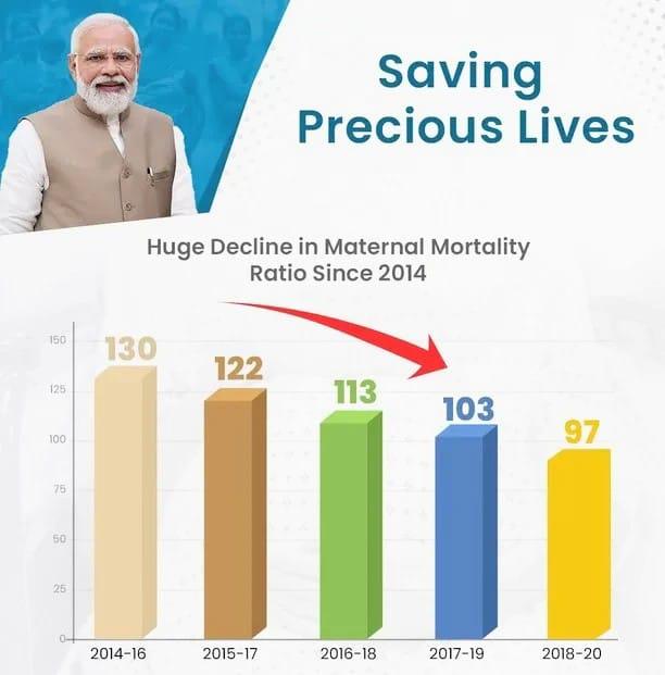 मातृ मृत्यु दर(एमएमआर) को प्रति 100,000 जीवित प्रसव पर एक निश्चित समय अवधि के दौरान मातृ मृत्यु की संख्या के रूप में परिभाषित किया गया है।नमूना पंजीकरण प्रणाली (एसआरएस) से प्राप्त आंकड़ों के अनुसार, देश ने एमएमआर में प्रगतिशील तरीके से कमी देखी है। यह 2014-2016 में 130, 2015-17 में 122, 2016-18 में 113, 2017-19 में 103 और 2018-20 में 97 रहा है। भारत ने 100/लाख से कम जीवित प्रसव के एमएमआर के लिए राष्ट्रीय स्वास्थ्य नीति (एनएचपी) लक्ष्य को हासिल कर लिया है और 2030 तक 70/लाख जीवित प्रसव से कम एमएमआर के एसडीजी लक्ष्य को प्राप्त करने के लिए सही रास्ते पर है।सतत विकास लक्ष्य (एसडीजी) लक्ष्य हासिल करने वाले राज्यों की संख्या के संदर्भ में हुई उत्कृष्ट प्रगति के बाद यह अब केरल (19) के साथ छह से बढ़कर आठ हो गई है, इसके बाद महाराष्ट्र (33), तेलंगाना (43), आंध्र प्रदेश (45), तमिलनाडु (54), झारखंड (56), गुजरात (57) और अंत में कर्नाटक (69) का स्थान है।राष्ट्रीय स्वास्थ्य मिशन (एनएचएम) के तहत, वर्ष 2014 से भारत ने सुलभ गुणवत्ता वाली मातृ एवं नवजात स्वास्थ्य सेवाएं प्रदान करने और रोकथाम योग्य मातृ मृत्यु अनुपात को कम करने के लिए एक ठोस प्रयास किया है। राष्ट्रीय स्वास्थ्य मिशन ने विशेष रूप से निर्दिष्ट एमएमआर लक्ष्यों को पूरा करने हेतु मातृ स्वास्थ्य कार्यक्रमों के प्रभावी कार्यान्वयन के लिए स्वास्थ्य सेवाओं के प्रावधान को सुनिश्चित करने के उद्देश्य से महत्वपूर्ण निवेश किया है। “जननी शिशु सुरक्षा कार्यक्रम” और “जननी सुरक्षा योजना” जैसी सरकारी योजनाओं को संशोधित किया गया है और इन्हें सुरक्षित मातृत्व आश्वासन (सुमन) जैसी अधिक सुनिश्चित एवं सम्मानजनक सेवा वितरण योजनाओं में अपग्रेड किया गया है। प्रधानमंत्री सुरक्षित मातृत्व अभियान (पीएमएसएमए) विशेष रूप से उच्च जोखिम वाले गर्भधारण की पहचान करने और उनके उचित प्रबंधन को सुविधाजनक बनाने पर केंद्रित है। रोकी जा सकने वाली मृत्यु दर को कम करने पर इसका महत्वपूर्ण प्रभाव पड़ा है। लक्ष्य और मिडवाइफरी पहल सभी गर्भवती महिलाओं को सुरक्षित प्रसव कराने का विकल्प सुनिश्चित करते हुए एक सम्मानजनक तथा गरिमापूर्ण तरीके से गुणवत्तापूर्ण देखभाल को बढ़ावा देने पर ध्यान केंद्रित करती हैं।एमएमआर दर को सफलतापूर्वक कम करने में भारत के उत्कृष्ट प्रयास वर्ष 2030 के निर्धारित समय से पहले 70 से कम एमएमआर के एसडीजी लक्ष्य को प्राप्त करने और सम्मानजनक मातृ देखभाल प्रदान करने वाले राष्ट्र के रूप में माने जाने पर एक आशावादी दृष्टिकोण उपलब्ध कराते हैं।