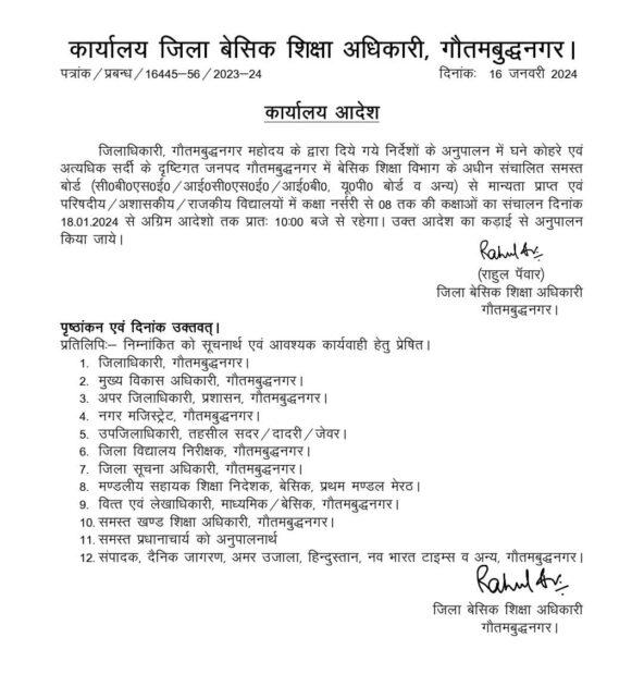 नॉएडा :- इस वक्त गौतमबुद्ध नगर में ठंड और कोहरे को देखते हुए गौतमबुद्ध नगर के कक्षा नर्सरी से आठवीं तक के सभी स्कूल 18 जनवरी से 10 बजे से संचालित होंगे। यह आदेश बेसिक शिक्षा अधिकारी राहुल पंवार ने जारी किया है। यह हम आप को बता दें की इससे पहले बढ़ती ठंड और घने कोहरे को देखते हुए फैसला लिया गया था की गौतम बुद्ध नगर में 16 जनवरी तक स्कूलों में छुट्टियां रहेंगी।
