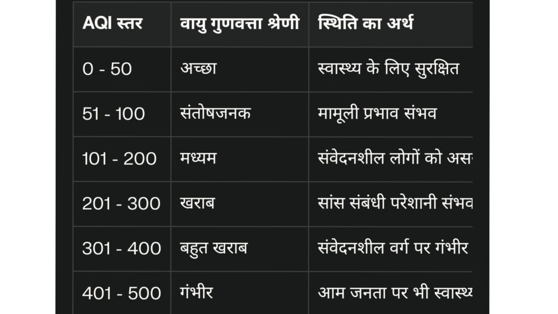 वायु गुणवत्ता सूचकांक (AQI) के अनुसार प्रदूषण स्तर की श्रेणियां