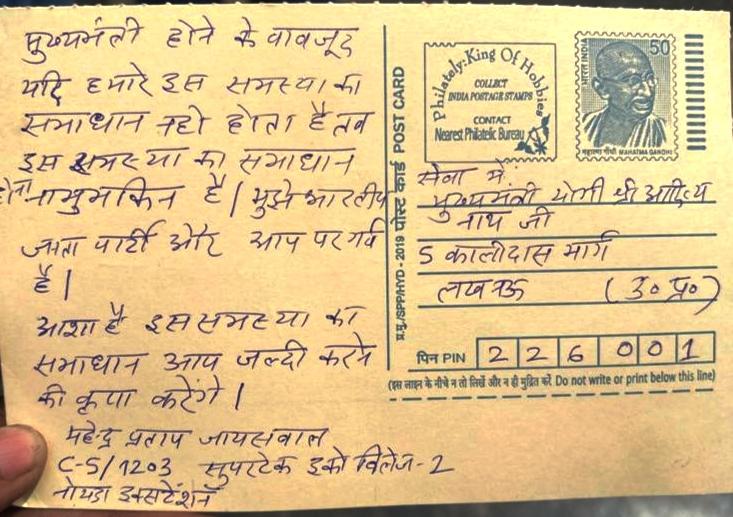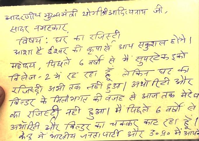 नोएडा :- पिछले लंबे समय से ग्रेटर नोएडा में घर खरीदारों का प्रदर्शन लगातार जारी है। रविवार को घर खरीदारों ने विशेष अभियान चलाया। उन्होंने उत्तर प्रदेश के मुख्यमंत्री योगी आदित्यनाथ के नाम चिट्ठी लिखने का लड़ने किया। लोगों ने सीएम योगी आदित्यनाथ को चिट्ठी लिखकर घरों की रजिस्ट्री कराने और घर दिलाने की मांग की है । साथ ही लोगों ने परेशान होकर अब मुख्यमंत्री के नाम चिट्ठी लिखी है जिसको बुधवार को पोस्ट किया जाएगा।
