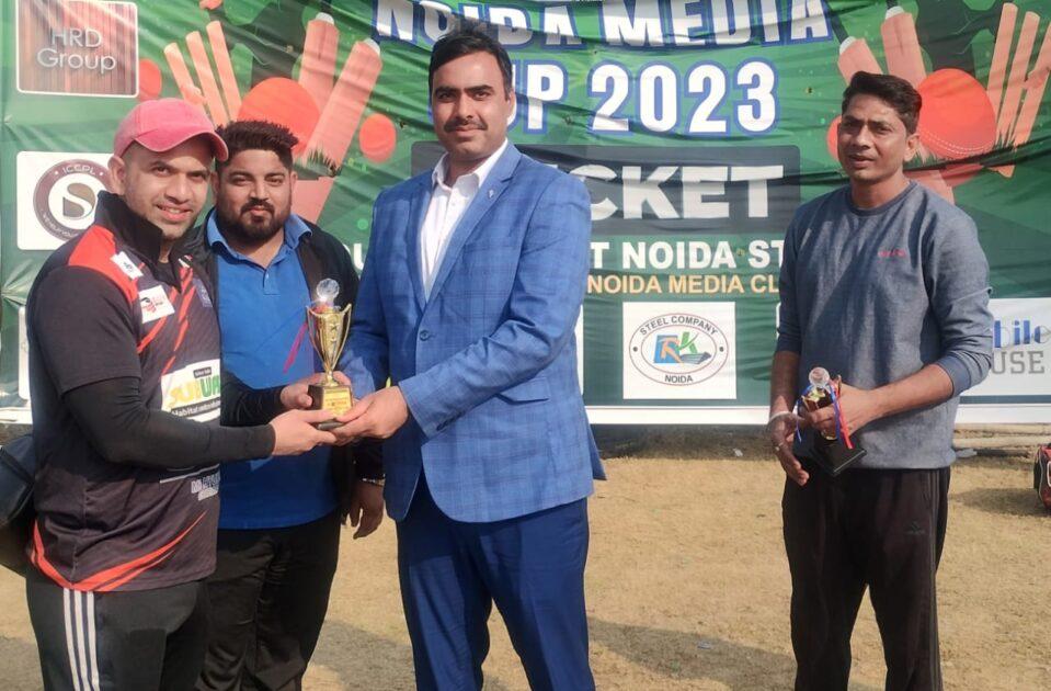 नोएडा :- आज नोएडा मीडिया क्लब द्वारा नोएडा स्थित एनसीआर स्पोर्ट्स ग्राउंड में नोएडा मीडिया कप 2023 का शुभारंभ किया गया जहां मुख्य अतिथि के तौर पर मेजर ध्यानचंद खेल रत्न अवार्ड, अर्जुन अवार्ड, द्रोणाचार्य अवार्ड और ध्यान चंद लाइफ टाइम अचीवमेंट अवॉर्ड की चयन समिति के सदस्य अभिषेक त्रिपाठी ने किया। उद्घाटन मैच में नोएडा मीडिया क्लब की टीम ने पहले बल्लेबाजी करते हुए सात विकेट के नुकसान पर 163 रन बनाए जिसमे विकास ने 68 और इंदर ने 32 रनो की पारी खेली। एनईए की तरफ से अनस और कुमार अनुराग ने दो दो विकेट लिए। लक्ष्य का पीछा करने उतरी एन ई ए की टीम 17.3 ओवर में 155 रन ही सिमट गई । वीरु ने 81 रन और कुलदीप ने 17 रन की पारी खेली। नोएडा मीडिया क्लब की तरफ से विजय द्विवेदी ने 3 और विकास ने 2 विकेट लिए। मदरलैंड अस्पताल के चेयरमैन डॉ बबित कुमार ने विकास को मैन आफ द मैच और वीरू को फाइटर ऑफ़ मैच से सम्मानित किया। वही दूसरा मैच टीवी 9 डिजिटल और ज़ी अनफिट 11 के बीच खेला गया। पहले बल्लेबाजी करते हुए टीवी 9 डिजिटल की टीम 104 रन बना पाई। सुशांत चतुर्वेदी ने 49 रन की पारी खेली। जी अनफिट 11 की तरफ से कप्तान जादूगर ने 4 विकेट लिए और राहुल मिश्र ने तीसरे ओवर में लगातार 4 विकेट लिए। जवाब में जी अनफिट 11 ने नौवें ओवर में 8 विकेट से मैच जीत लिए।