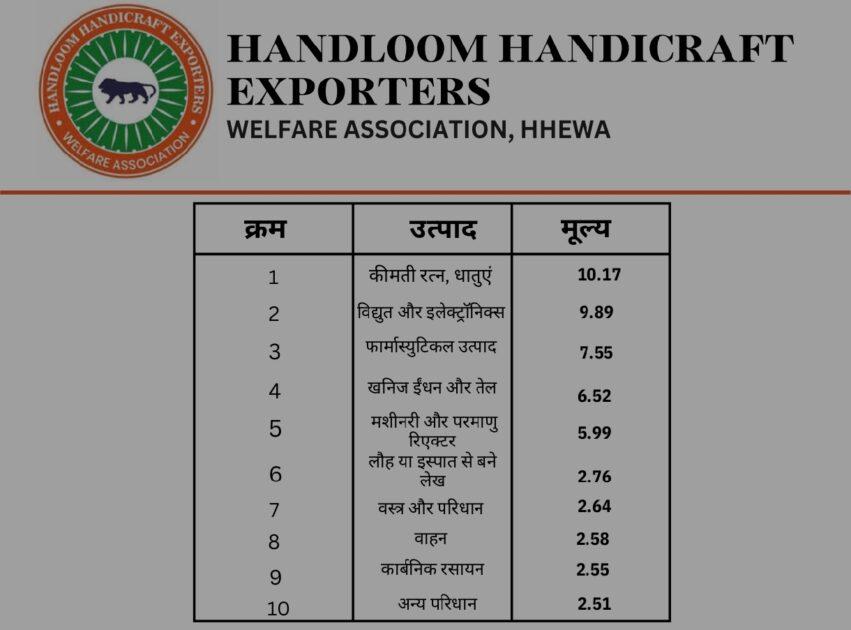 एचएचईडब्ल्यूए के आंकड़ों के अनुसार, अमेरिका को निर्यात किए जाने वाले शीर्ष 10 उत्पाद निम्नलिखित थेः